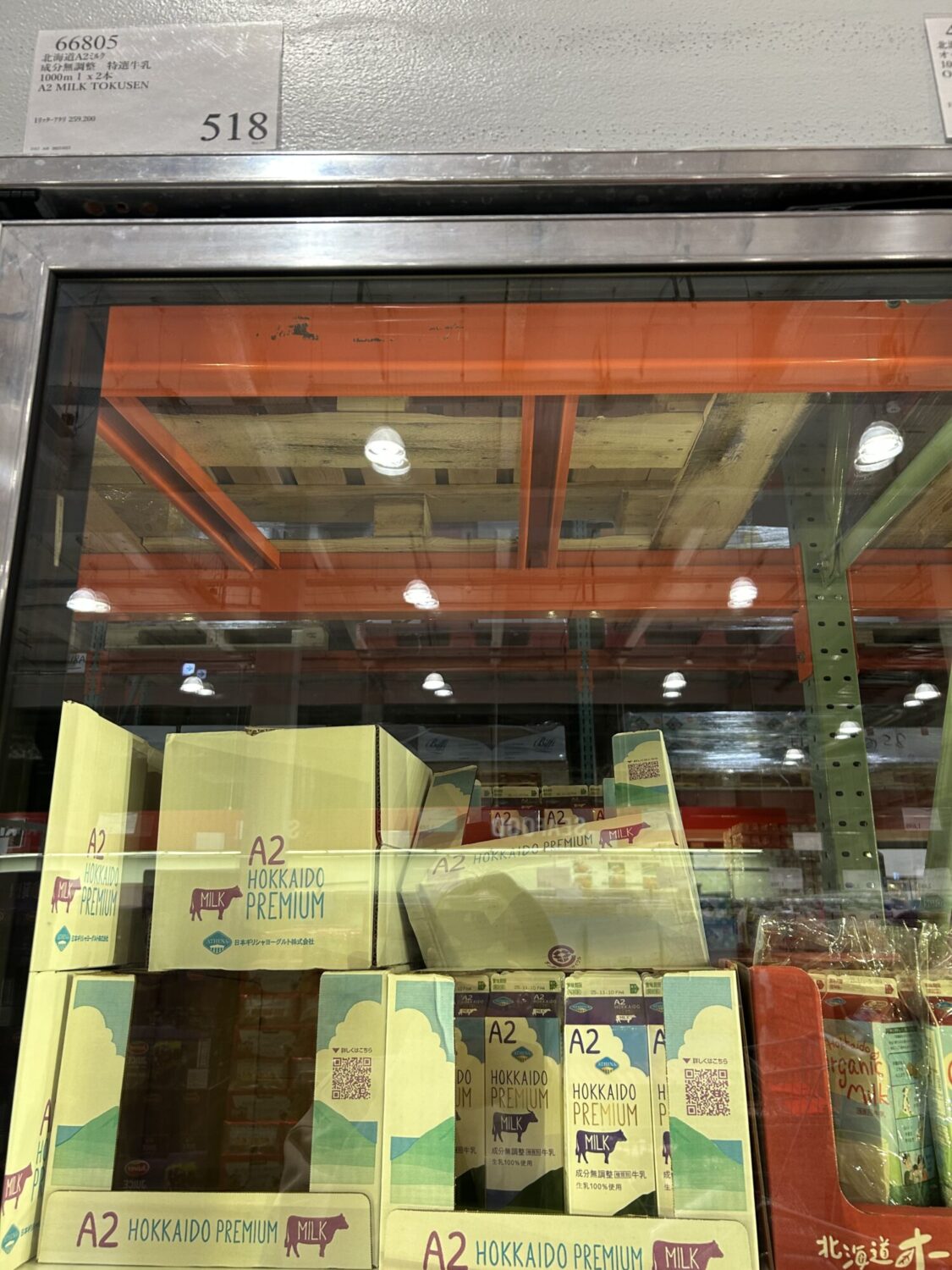 大きな扉がついた冷蔵ドリンクコーナー、筆者がコストコに行った時にもこちらに置いてありました。大きなボトルのジュースやオーツミルクなど、一緒に置いてあるものは時期などにより異なるようです。