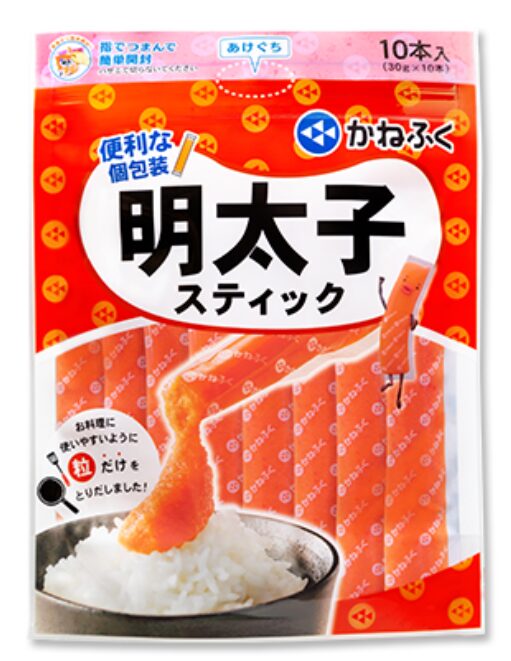 かねふくの明太子スティックは、かねふくの明太子スティックは、使いやすい個包装タイプ。流水解凍で手軽に使え、ピリ辛の旨みがご飯やパスタによく合います。冷凍庫に常備したい一品です。