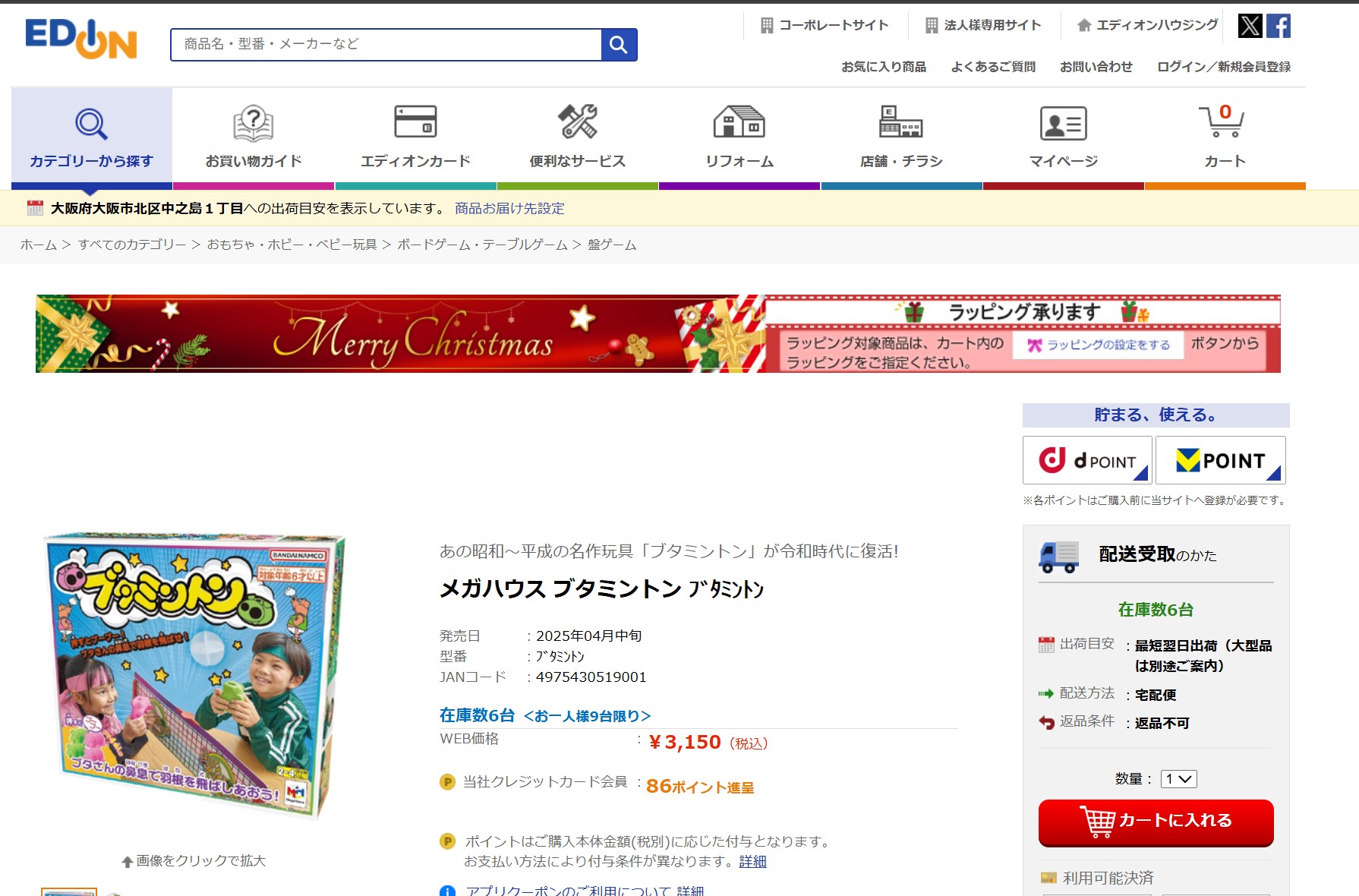 ブタミントンは次の家電量販店で販売されている情報が確認できました。