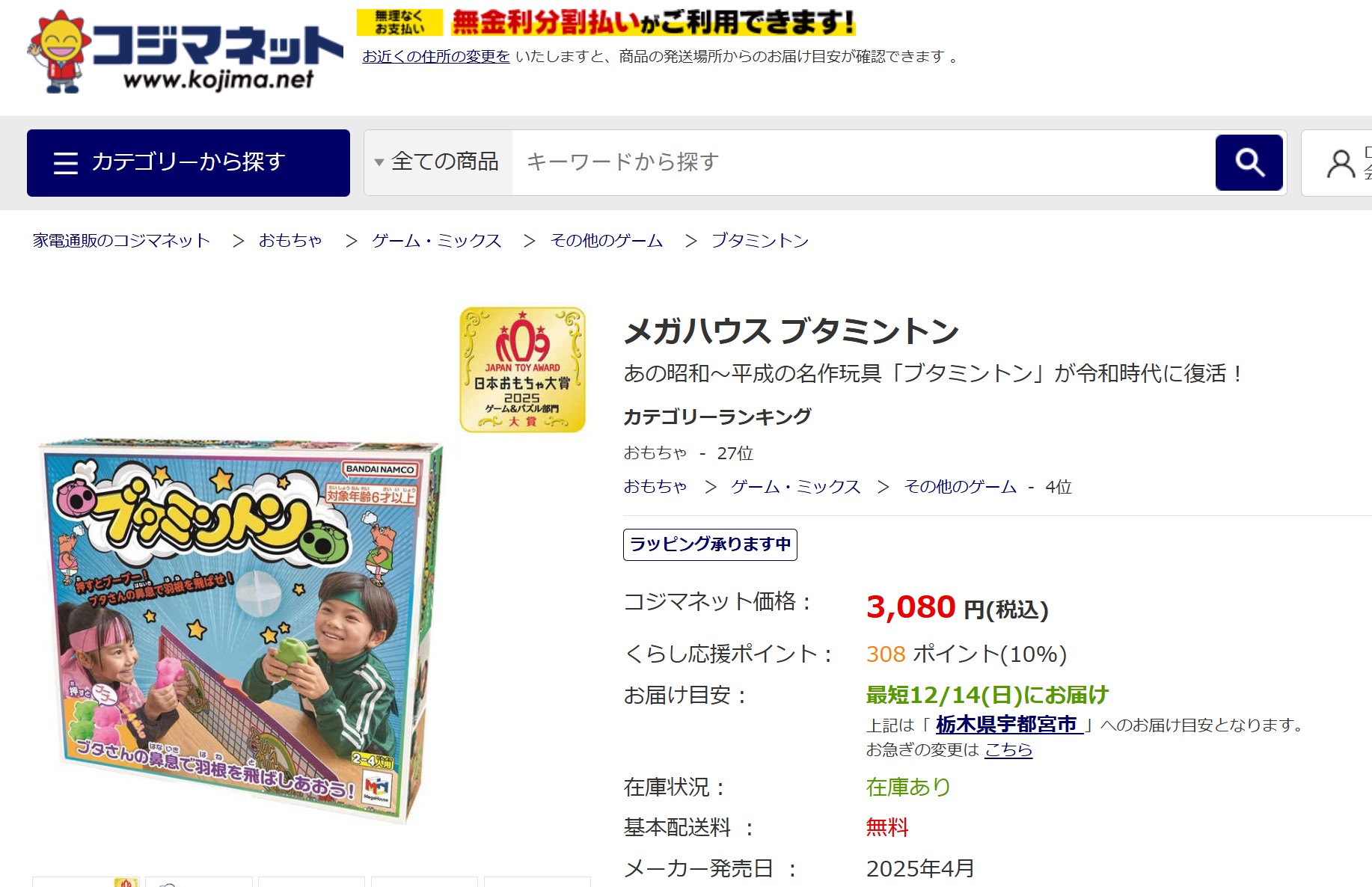 また、ブタミントンを買える場所はビックカメラやコジマなど他にもありますので、身近な販売店を選んでみて下さいね!
