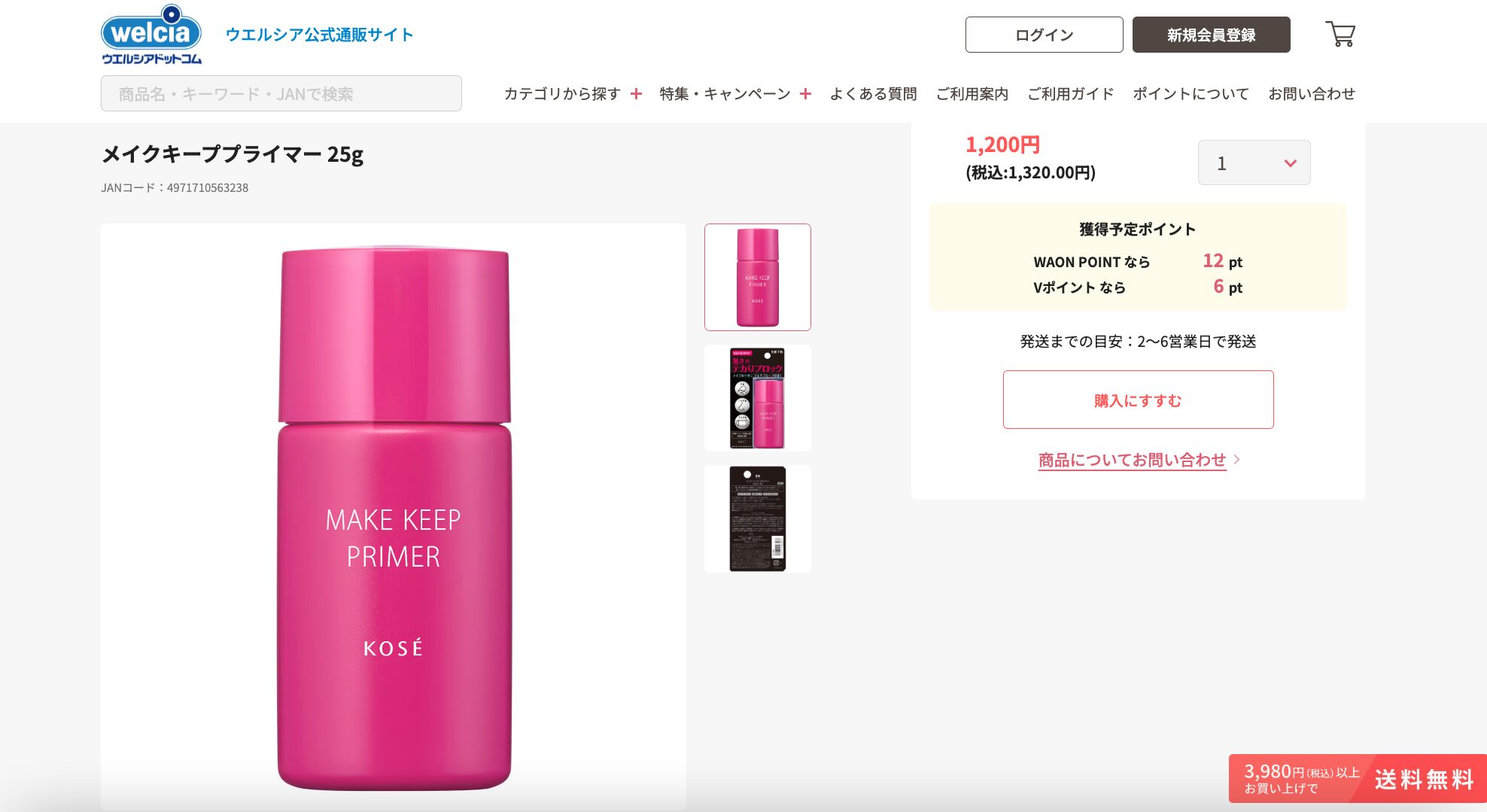 2025年6月時点の情報では、メイクキーププライマーが1,320円で販売されています。こちらは税込3,980円以上のお買い物で送料無料となります。