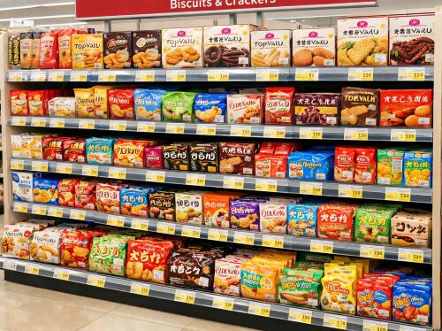 ビスケットやクッキーが並んでいる棚を中心に探してみましょう。