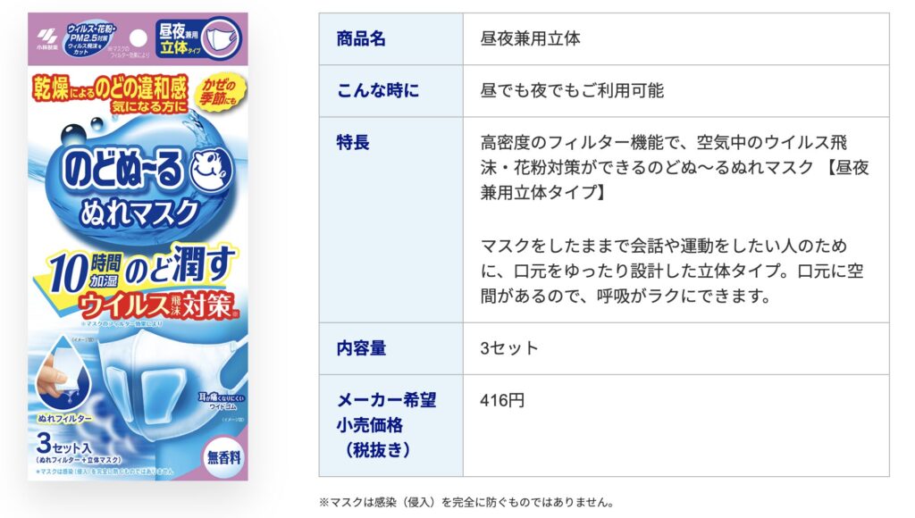 ローソンで販売されているのどぬーる マスクを調べたところ、以下の商品が取り扱われていることがわかりました。