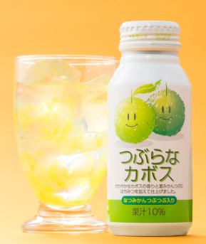 • つぶらなカボスは、大分県産かぼす果汁をつかったジュースで夏みかんの果粒が入っている。